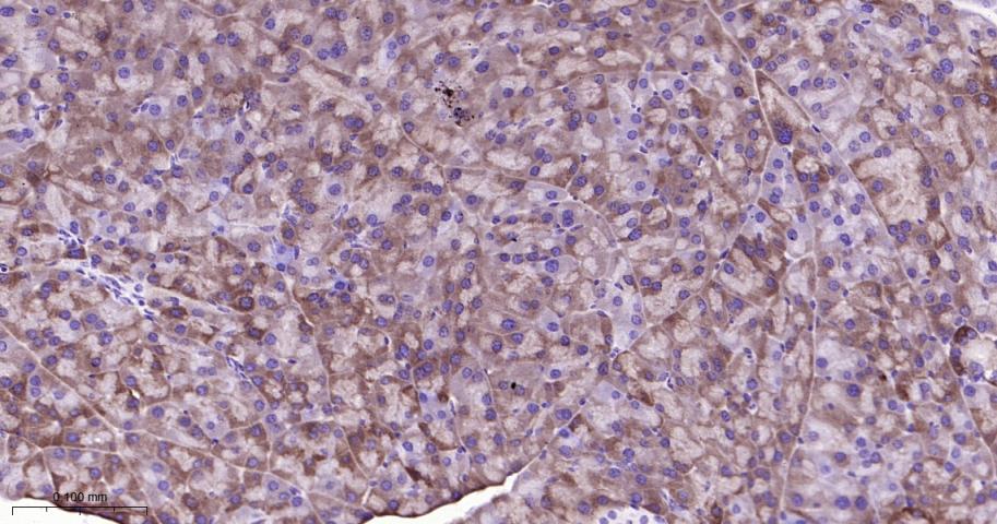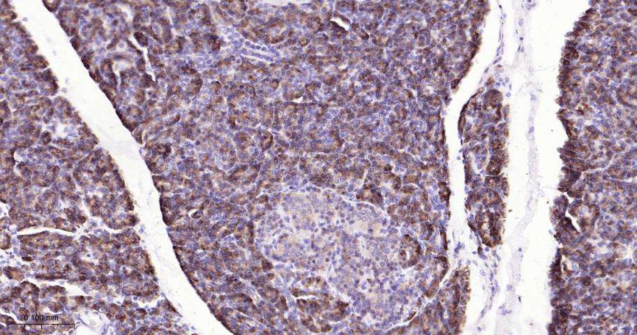 Paraformaldehyde-fixed, paraffin embedded Rat Pancreas; Antigen retrieval by boiling in sodium citrate buffer (pH6.0) for 15 min; The section was incubated with Peroxiredoxin-4 Monoclonal Antibody, Unconjugated (bsm-61828R) at 1:200 overnight at 4°C, followed by conjugation to the bs-0295G-HRP and DAB (C-0010) staining.