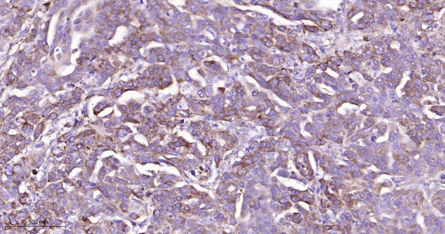 Paraformaldehyde-fixed, paraffin embedded Human Ovarian Cancer; Antigen retrieval by boiling in sodium citrate buffer (pH6.0) for 15 min; The section was incubated with Peroxiredoxin-4 Monoclonal Antibody, Unconjugated (bsm-61828R) at 1:200 overnight at 4°C, followed by conjugation to the bs-0295G-HRP and DAB (C-0010) staining.