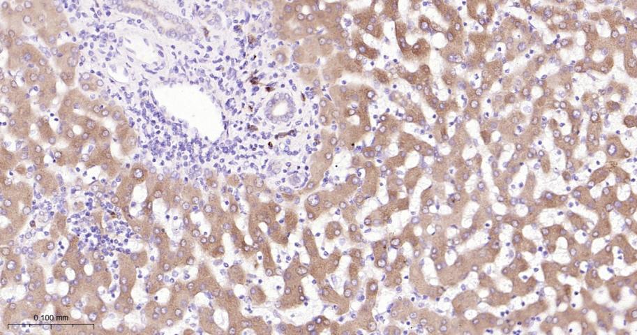 Paraformaldehyde-fixed, paraffin embedded Human Liver; Antigen retrieval by boiling in sodium citrate buffer (pH6.0) for 15 min; The section was incubated with Peroxiredoxin-4 Monoclonal Antibody, Unconjugated (bsm-61828R) at 1:200 overnight at 4°C, followed by conjugation to the bs-0295G-HRP and DAB (C-0010) staining.