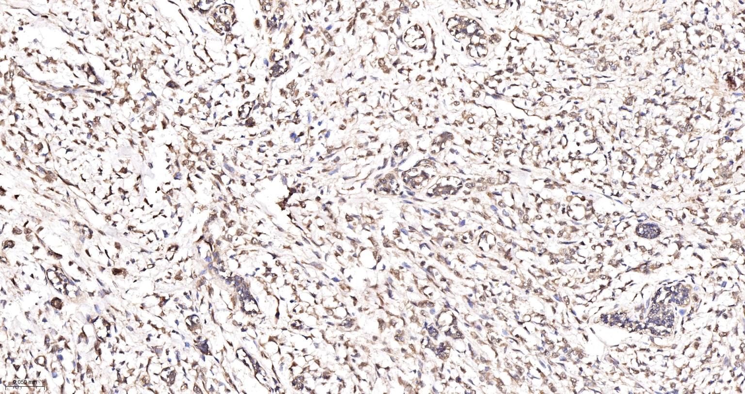 Paraformaldehyde-fixed, paraffin embedded Human Breast Cancer; Antigen retrieval by boiling in sodium citrate buffer (pH6.0) for 15 min; The section was incubated with VPS35 Monoclonal Antibody, Unconjugated (bsm-61829R) at 1:200 overnight at 4°C, followed by conjugation to the bs-0295G-HRP and DAB (C-0010) staining.