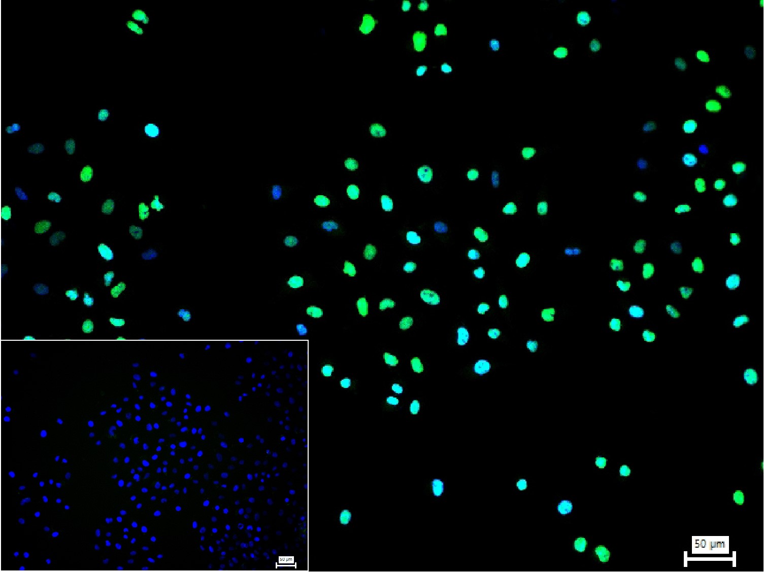 4% Paraformaldehyde-fixed A549 (H) cell; Triton X-100 at r.t. for 20 min; Antibody incubation with (NEDD4) monoclonal Antibody, unconjugated (bsm-61830R) 1:100, 90 min at 37°C; followed by conjugated Goat Anti-Rabbit IgG antibody (green, bs-60295G-BF488) at 37°C for 90 min, DAPI (blue, C02-04002) was used to stain the cell nuclei. PBS instead of the primary antibody was used as the blank control.