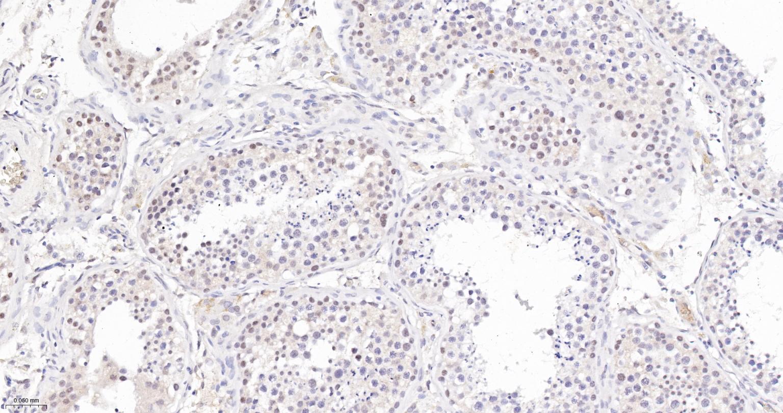 Paraformaldehyde-fixed, paraffin embedded Human Testicles; Antigen retrieval by boiling in sodium citrate buffer (pH6.0) for 15 min; The section was incubated with BCLAF1 Monoclonal Antibody, Unconjugated (bsm-62880R) at 1:200 overnight at 4°C, followed by conjugation to the bs-0295G-HRP and DAB (C-0010) staining.