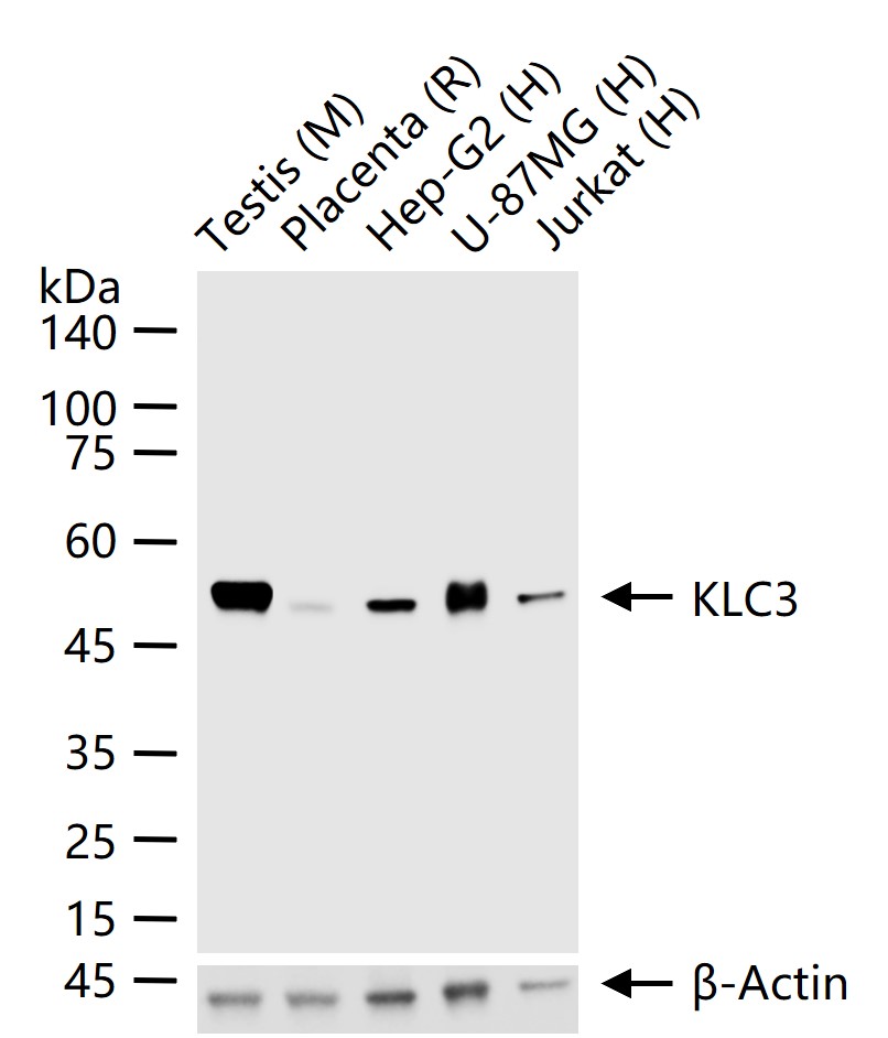 25 ug total protein per lane of various lysates (see on figure) probed with KLC3 monoclonal antibody, unconjugated (bsm-62881R) at 1:1000 dilution and 4°C overnight incubation. Followed by conjugated secondary antibody incubation at r.t. for 60 min.