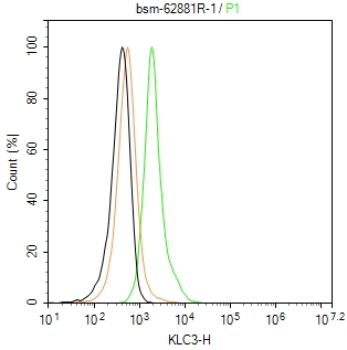 The HepG2 (H) cells were fixed with 4% PFA (10 min at r.t.) and then permeabilized with 90% ice-cold methanol for 20 min at -20℃,the cells then were incubated in 5%BSA to block non-specific protein-protein interactions (30 min at r.t.), followed by secondary antibody incubation for 40 min at room temperature. Primary Antibody (green):Rabbit Anti-KLC3 antibody (bsm-62881R,1:100); Isotype Control (orange): Rabbit IgG (bs-0295P). Blank control (black): PBS. Acquisition of 20,000 events was performed.