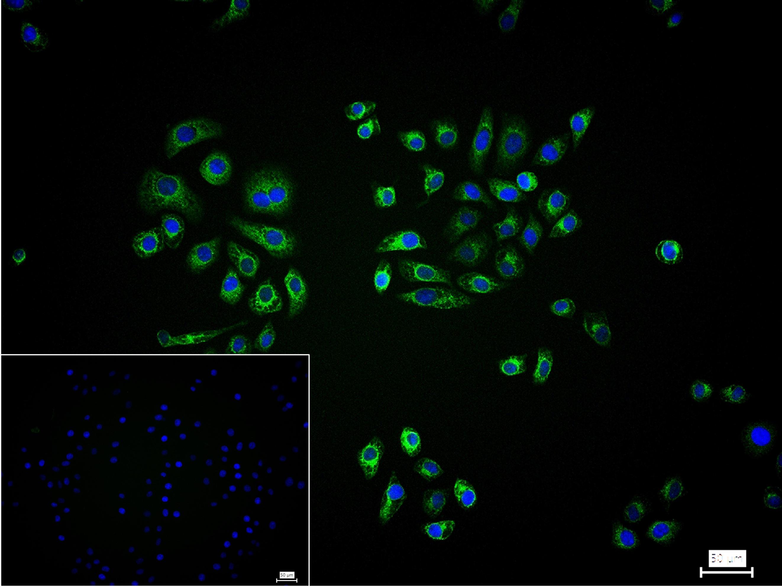 4% Paraformaldehyde-fixed HepG2 (H) cell; Triton X-100 at r.t. for 20 min; Antibody incubation with (KLC3) monoclonal Antibody, unconjugated (bsm-62881R) 1:100, 90 min at 37°C; followed by conjugated Goat Anti-Rabbit IgG antibody (green, bs-60295G-BF488) at 37°C for 90 min, DAPI (blue, C02-04002) was used to stain the cell nuclei. PBS instead of the primary antibody was used as the blank control.