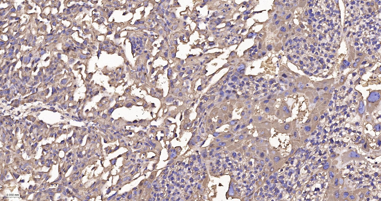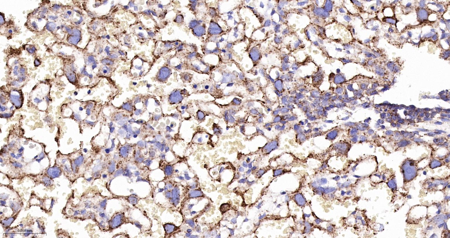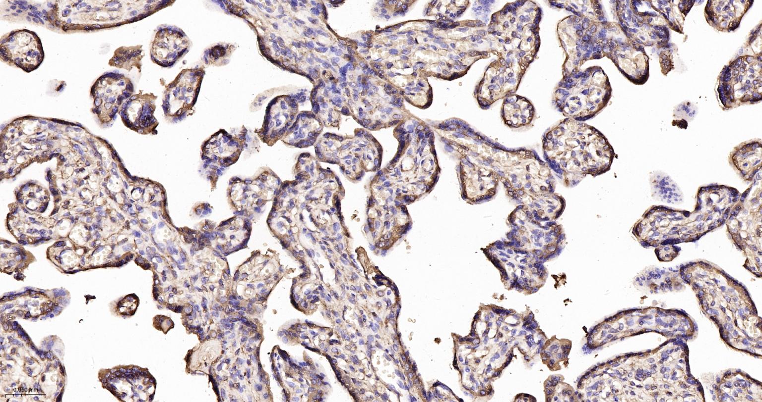 Paraformaldehyde-fixed, paraffin embedded Human Placenta; Antigen retrieval by boiling in sodium citrate buffer (pH6.0) for 15 min; The section was incubated with KLC3 Monoclonal Antibody, Unconjugated (bsm-62881R) at 1:200 overnight at 4°C, followed by conjugation to the bs-0295G-HRP and DAB (C-0010) staining.