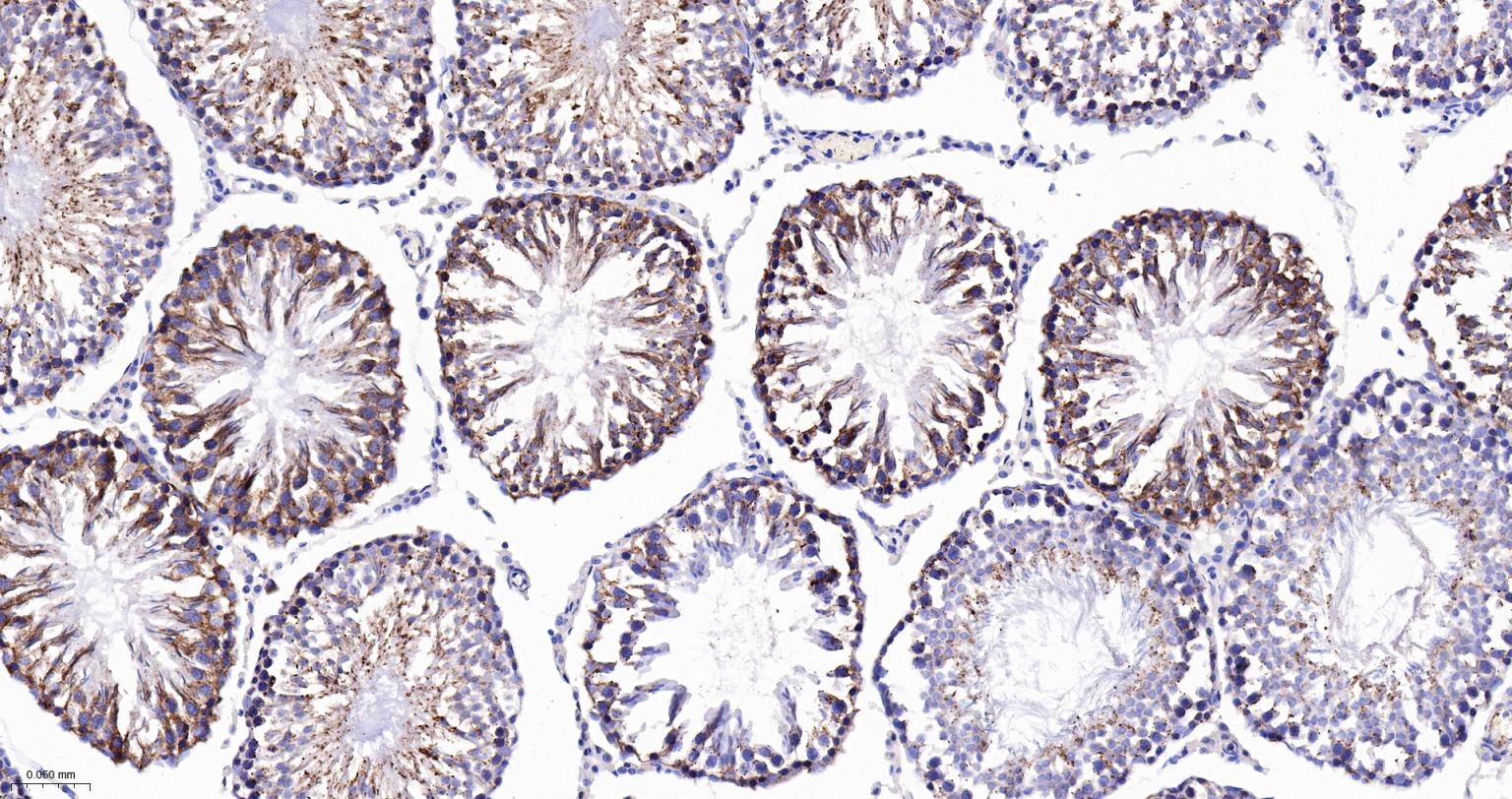 Paraformaldehyde-fixed, paraffin embedded Rat Testicles; Antigen retrieval by boiling in sodium citrate buffer (pH6.0) for 15 min; The section was incubated with KLC3 Monoclonal Antibody, Unconjugated (bsm-62881R) at 1:200 overnight at 4°C, followed by conjugation to the bs-0295G-HRP and DAB (C-0010) staining.