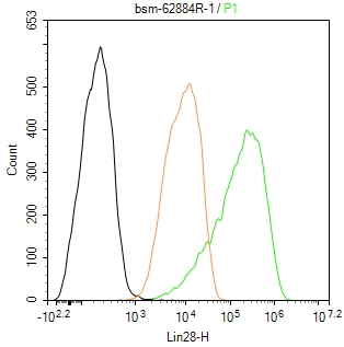 The NCCIT (H) cells were fixed with 4% PFA (10 min at r.t.) and then permeabilized with 90% ice-cold methanol for 20 min at -20℃,the cells then were incubated in 5%BSA to block non-specific protein-protein interactions (30 min at r.t.), followed by secondary antibody incubation for 40 min at room temperature. Primary Antibody (green):Rabbit Anti-Lin28 antibody (bsm-62884R,1:100); Isotype Control (orange): Rabbit IgG (bs-0295P). Blank control (black): PBS. Acquisition of 20,000 events was performed.
