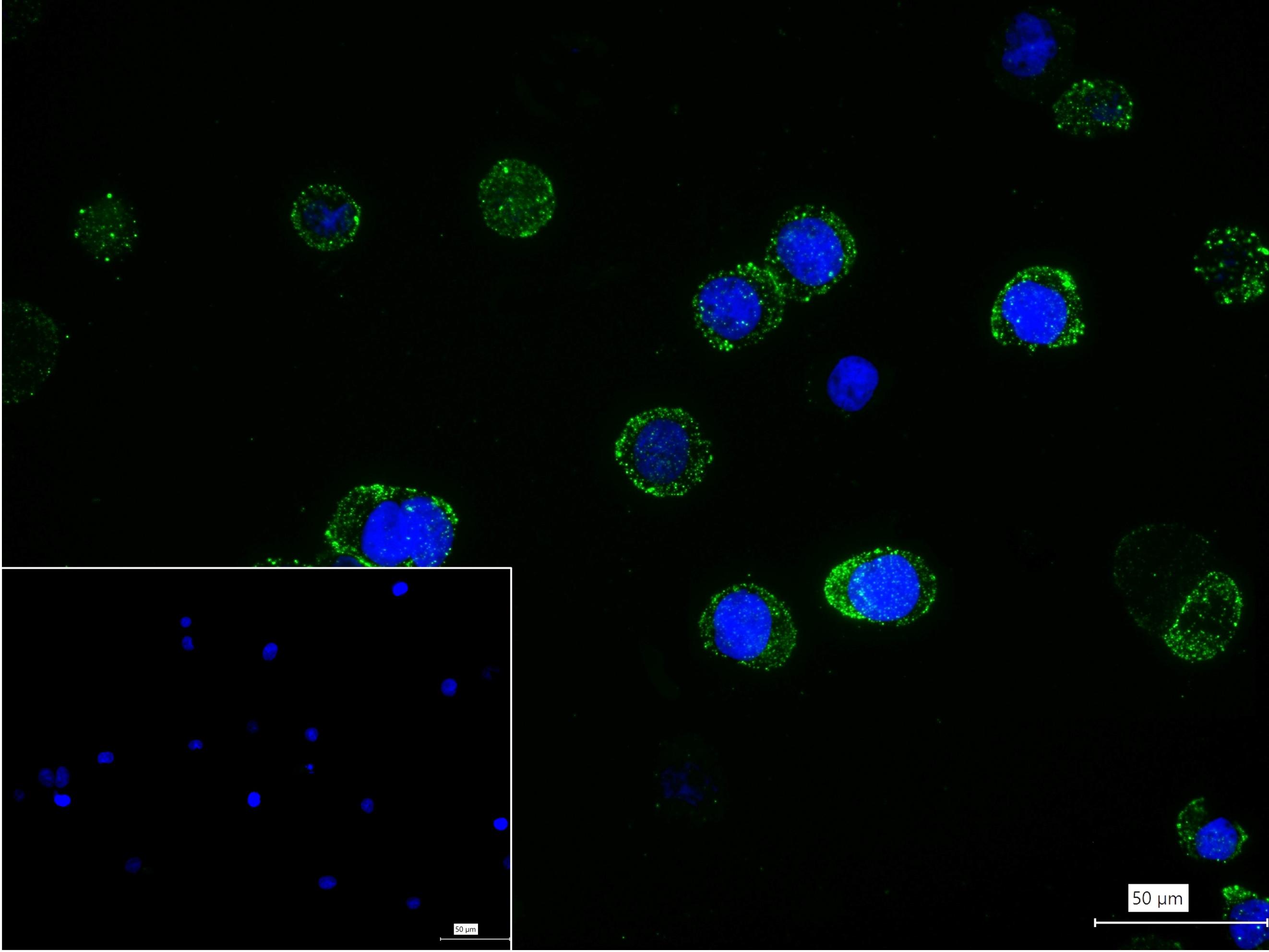 4% Paraformaldehyde-fixed Raji (H) cell; Triton X-100 at r.t. for 20 min; Antibody incubation with (CD10) monoclonal Antibody, unconjugated (bsm-62909R) 1:100, 90 min at 37°C; followed by conjugated Goat Anti-Rabbit IgG antibody (green, bs-60295G-BF488) at 37°C for 90 min, DAPI (blue, C02-04002) was used to stain the cell nuclei. PBS instead of the primary antibody was used as the blank control.