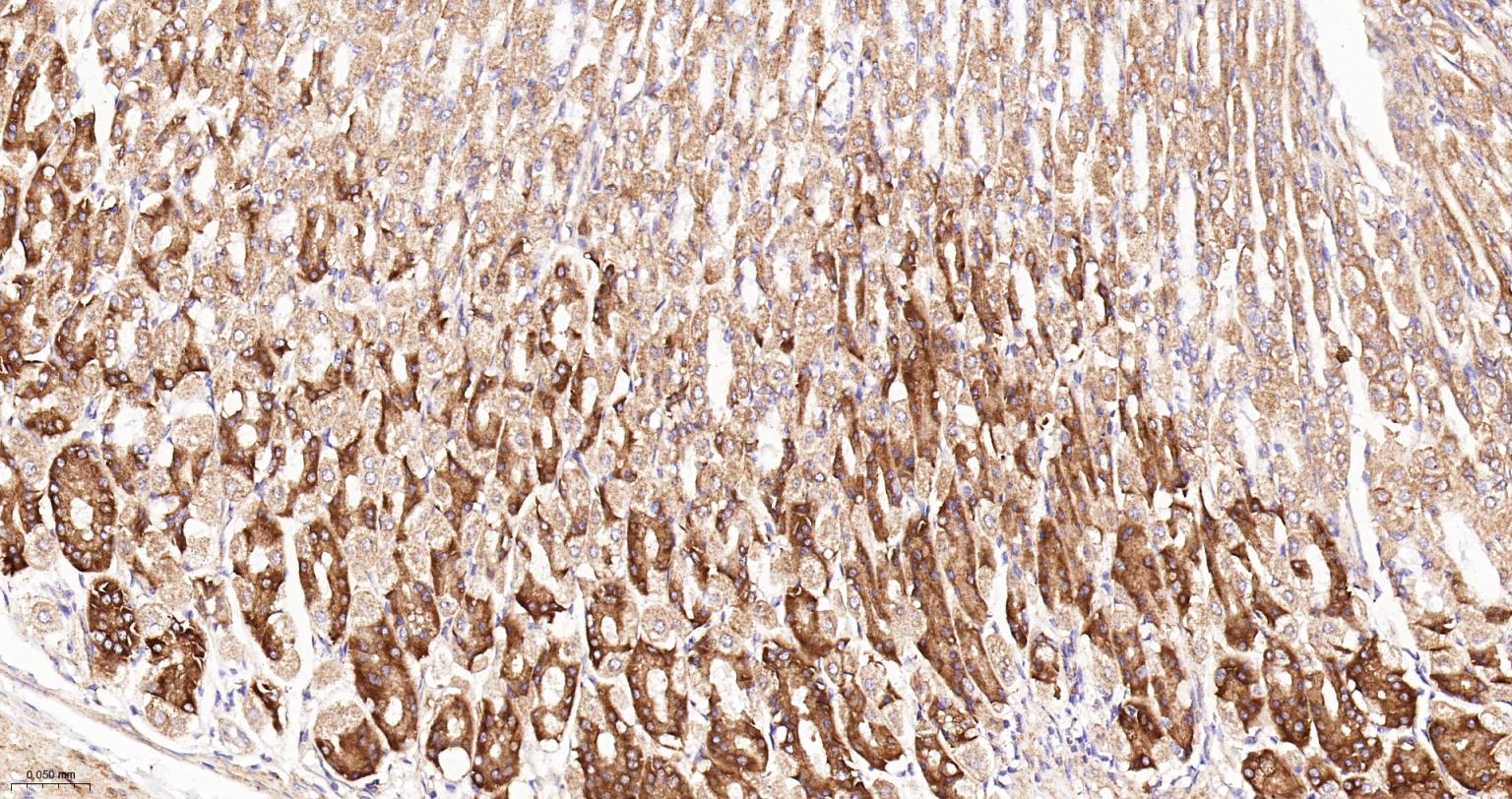 Paraformaldehyde-fixed, paraffin embedded Mouse Stomach; Antigen retrieval by boiling in sodium citrate buffer (pH6.0) for 15 min; The section was incubated with NDUFS4 Recombinant Monoclonal Antibody, Unconjugated (bsm-62919R) at 1:200 overnight at 4°C, followed by conjugation to the bs-0295G-HRP and DAB (C-0010) staining.