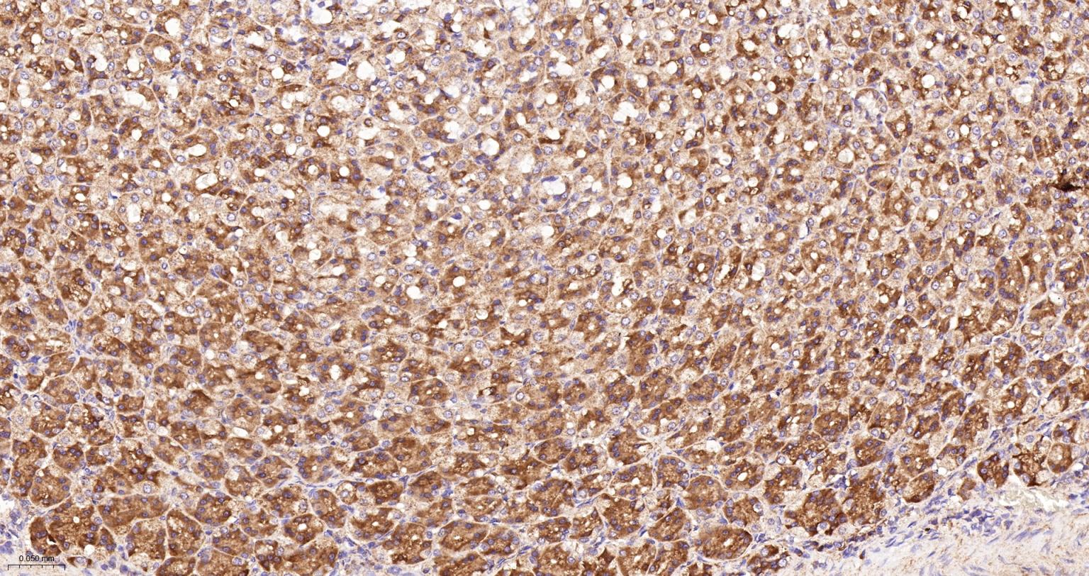Paraformaldehyde-fixed, paraffin embedded Rat Stomach; Antigen retrieval by boiling in sodium citrate buffer (pH6.0) for 15 min; The section was incubated with NDUFS4 Recombinant Monoclonal Antibody, Unconjugated (bsm-62919R) at 1:200 overnight at 4°C, followed by conjugation to the bs-0295G-HRP and DAB (C-0010) staining.
