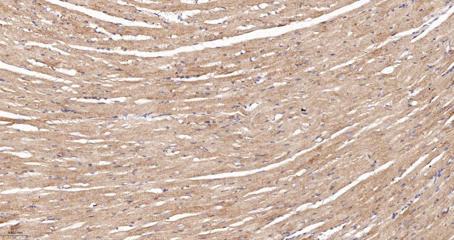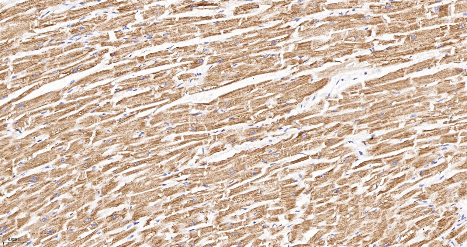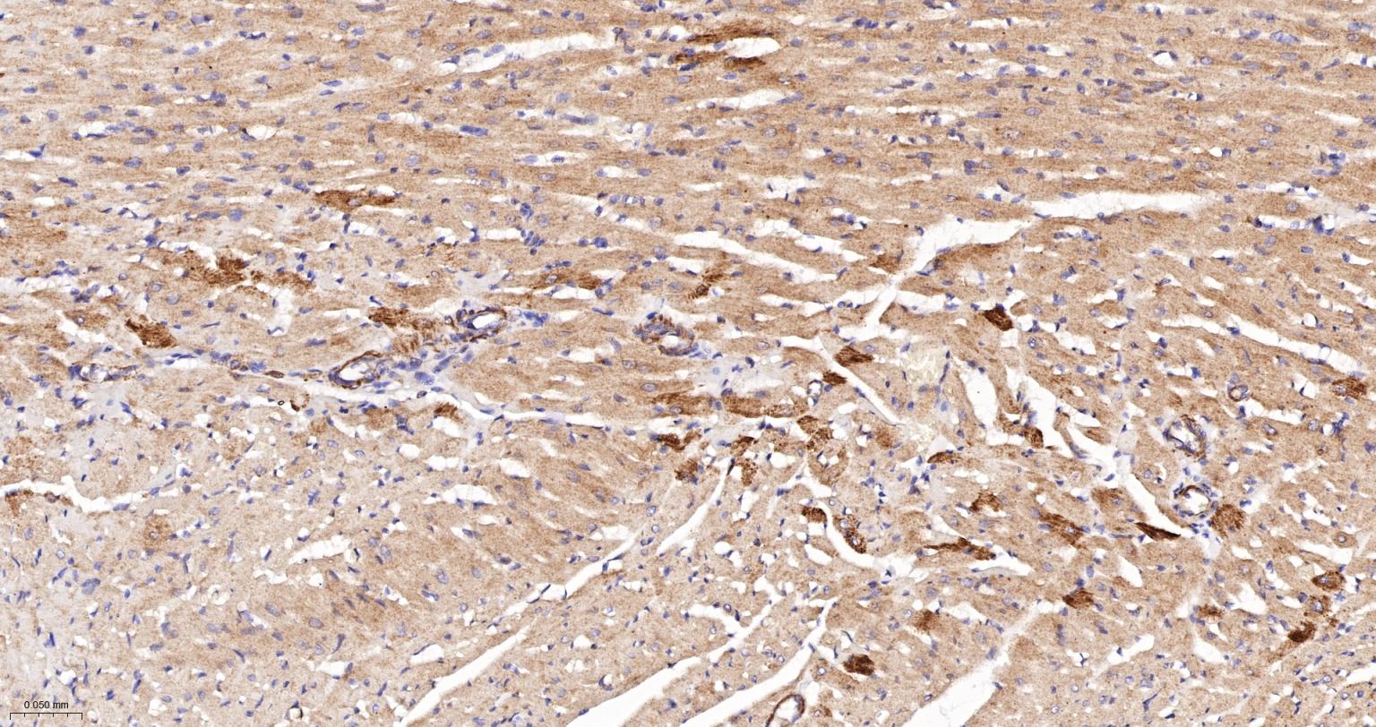 Paraformaldehyde-fixed, paraffin embedded Rat Heart; Antigen retrieval by boiling in sodium citrate buffer (pH6.0) for 15 min; The section was incubated with NDUFS4 Recombinant Monoclonal Antibody, Unconjugated (bsm-62919R) at 1:200 overnight at 4°C, followed by conjugation to the bs-0295G-HRP and DAB (C-0010) staining.