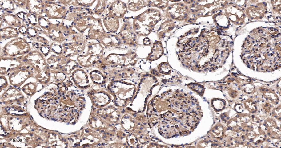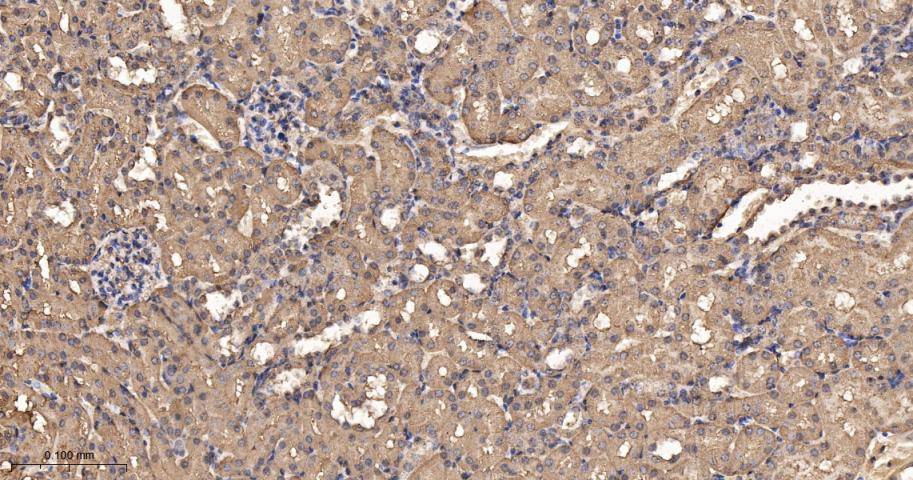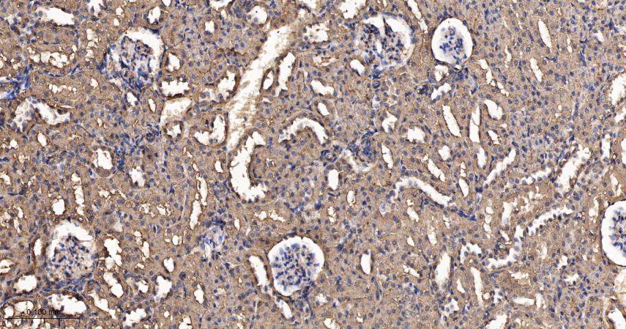 Paraformaldehyde-fixed, paraffin embedded Mouse Kidney; Antigen retrieval by boiling in sodium citrate buffer (pH6.0) for 15 min; The section was incubated with Ras Monoclonal Antibody, Unconjugated (bsm-62921R) at 1:200 overnight at 4°C, followed by conjugation to the bs-0295G-HRP and DAB (C-0010) staining.