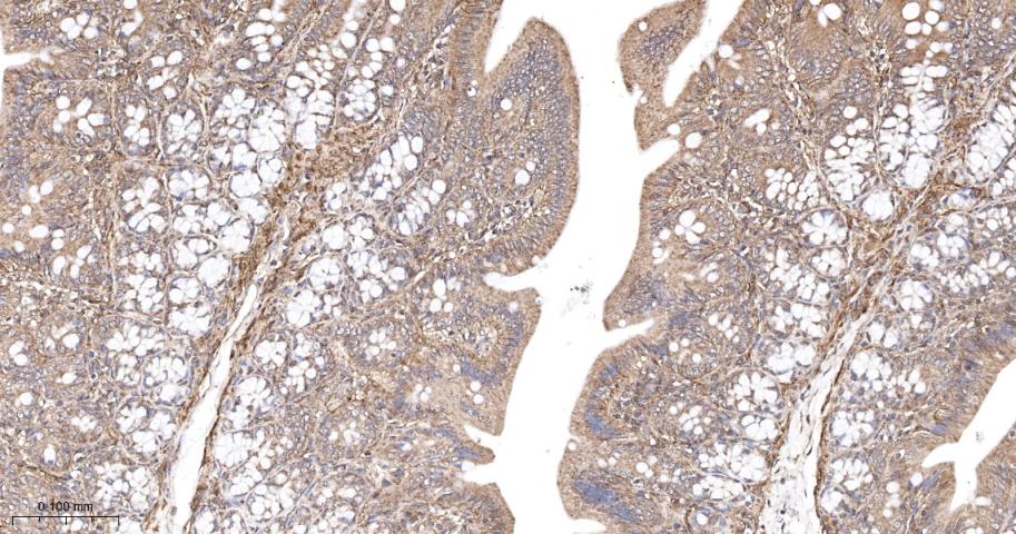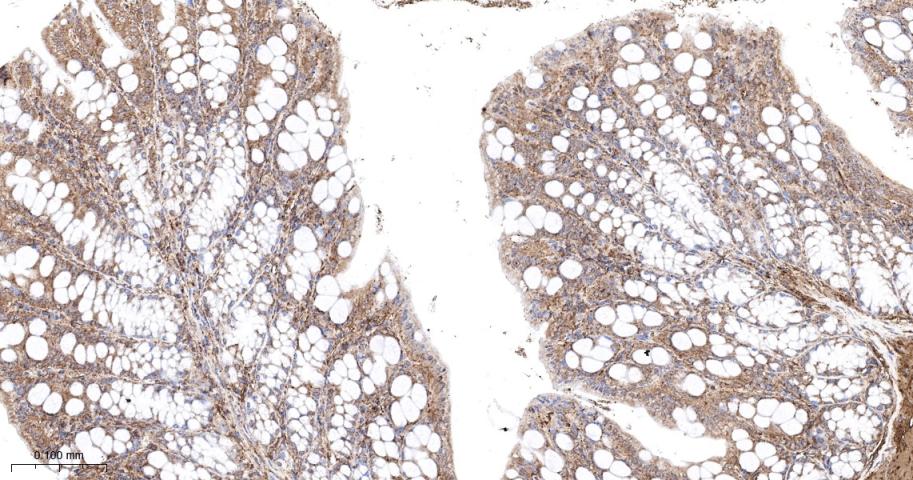 Paraformaldehyde-fixed, paraffin embedded Mouse Colon; Antigen retrieval by boiling in sodium citrate buffer (pH6.0) for 15 min; The section was incubated with Ras Monoclonal Antibody, Unconjugated (bsm-62921R) at 1:200 overnight at 4°C, followed by conjugation to the bs-0295G-HRP and DAB (C-0010) staining.