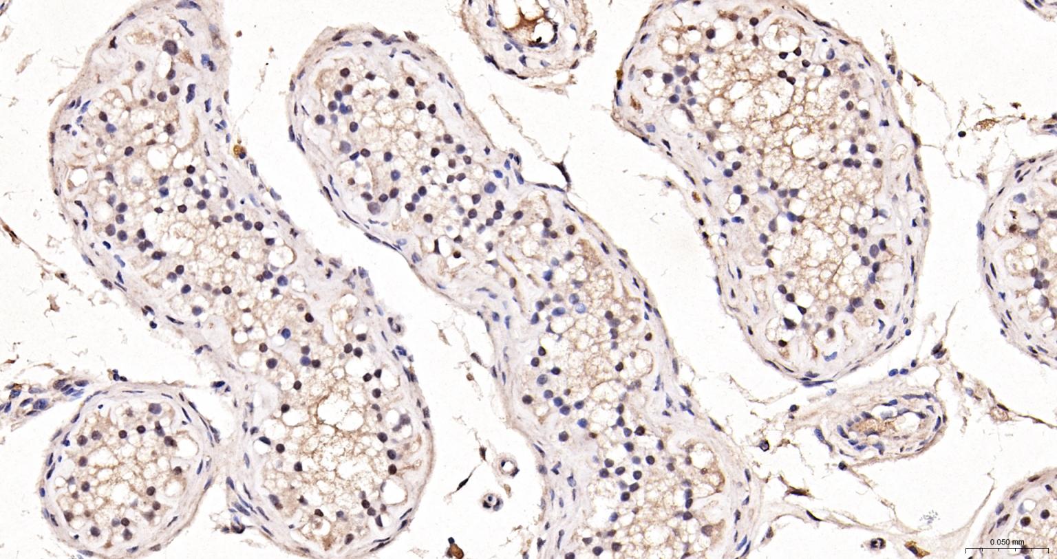 Paraformaldehyde-fixed, paraffin embedded Human Testicles; Antigen retrieval by boiling in sodium citrate buffer (pH6.0) for 15 min; The section was incubated with OTX1/2 Monoclonal Antibody, Unconjugated (bsm-62926R) at 1:200 overnight at 4°C, followed by conjugation to the bs-0295G-HRP and DAB (C-0010) staining.