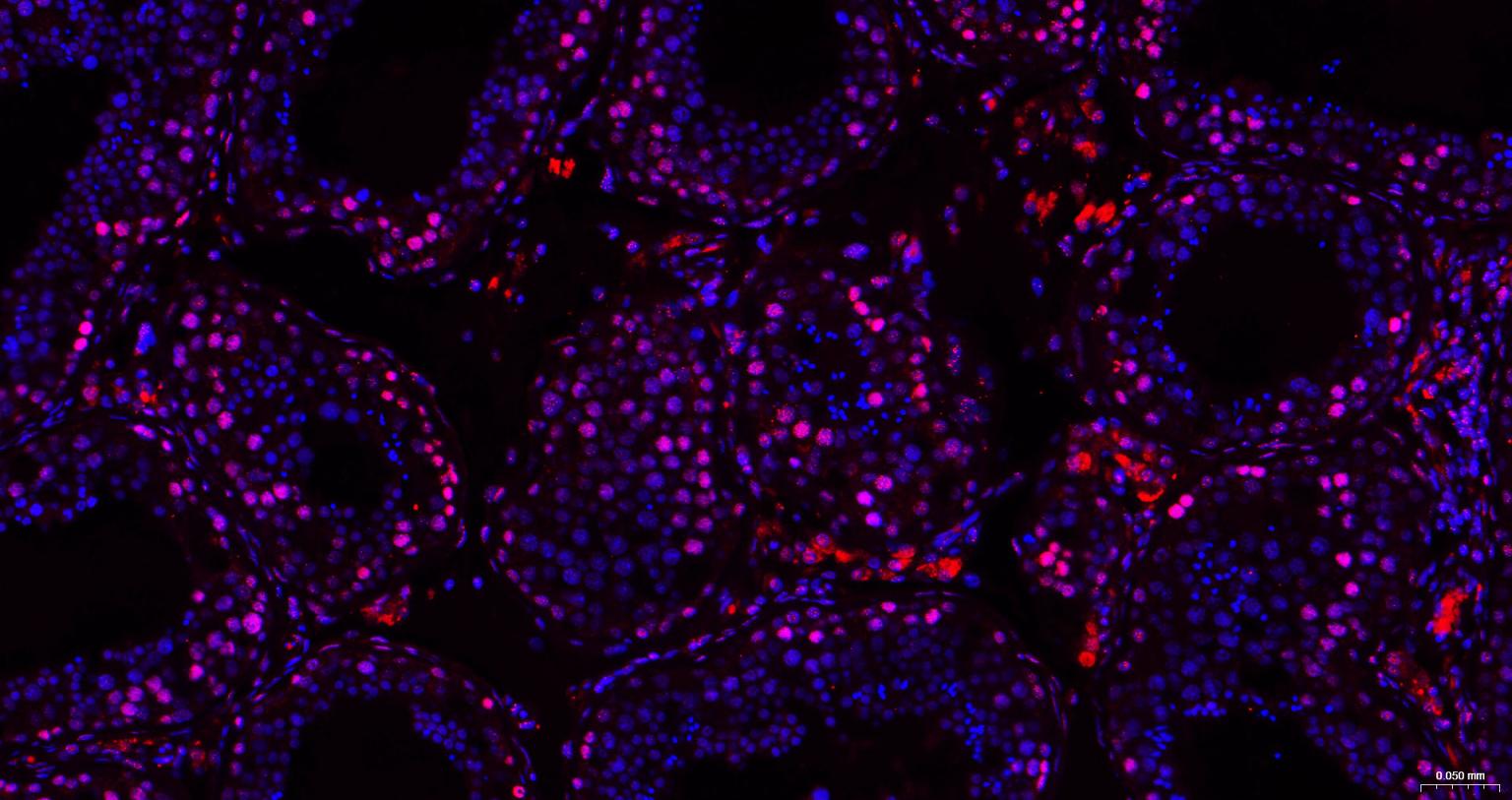 Paraformaldehyde-fixed, paraffin embedded human testicles; Antigen retrieval by boiling in sodium citrate buffer (pH6.0) for 15 min; The section was incubated with OTX1/2 Monoclonal Antibody, Unconjugated (bsm-62926R) at 1:200 overnight at 4°C. Followed by conjugated Goat Anti-Ratbbit IgG antibody (red, bs-0295G-BF594), DAPI (blue, C02-04002) was used to stain the cell nuclei.