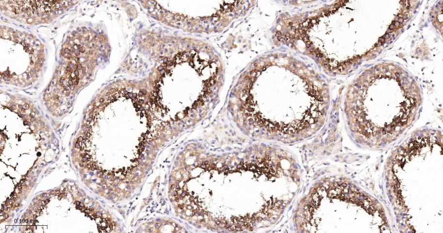 Paraformaldehyde-fixed, paraffin embedded Human Testicles; Antigen retrieval by boiling in sodium citrate buffer (pH6.0) for 15 min; The section was incubated with PKC delta/theta Monoclonal Antibody, Unconjugated (bsm-62953R) at 1:200 overnight at 4°C, followed by conjugation to the bs-0295G-HRP and DAB (C-0010) staining.