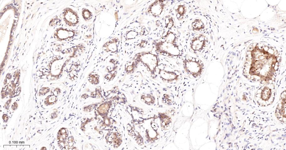 Paraformaldehyde-fixed, paraffin embedded Human Breast Cancer; Antigen retrieval by boiling in sodium citrate buffer (pH6.0) for 15 min; The section was incubated with PKC delta/theta Monoclonal Antibody, Unconjugated (bsm-62953R) at 1:200 overnight at 4°C, followed by conjugation to the bs-0295G-HRP and DAB (C-0010) staining.