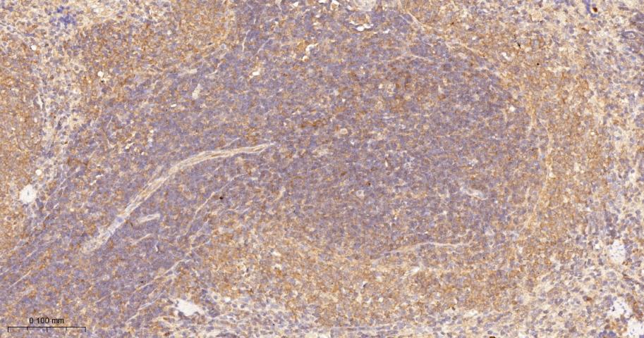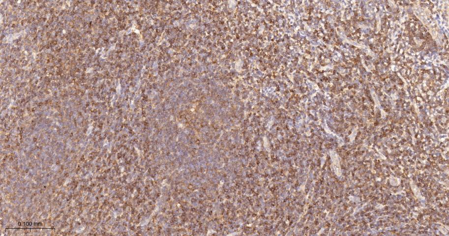 Paraformaldehyde-fixed, paraffin embedded Rat Spleen; Antigen retrieval by boiling in sodium citrate buffer (pH6.0) for 15 min; The section was incubated with PKC delta/theta Monoclonal Antibody, Unconjugated (bsm-62953R) at 1:200 overnight at 4°C, followed by conjugation to the bs-0295G-HRP and DAB (C-0010) staining.