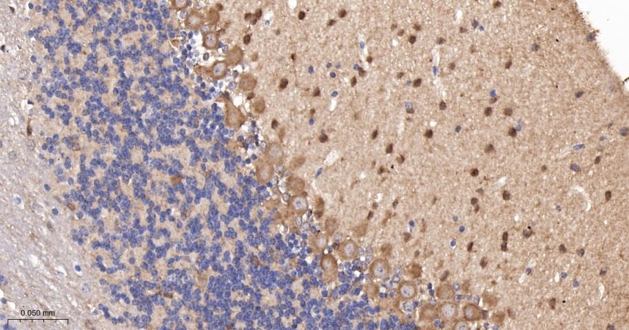Paraformaldehyde-fixed, paraffin embedded Mouse Cerebellum; Antigen retrieval by boiling in sodium citrate buffer (pH6.0) for 15 min; The section was incubated with PKC delta/theta Monoclonal Antibody, Unconjugated (bsm-62953R) at 1:200 overnight at 4°C, followed by conjugation to the bs-0295G-HRP and DAB (C-0010) staining.