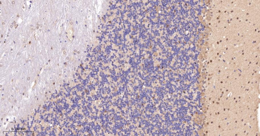 Paraformaldehyde-fixed, paraffin embedded Rat Cerebellum; Antigen retrieval by boiling in sodium citrate buffer (pH6.0) for 15 min; The section was incubated with PKC delta/theta Monoclonal Antibody, Unconjugated (bsm-62953R) at 1:200 overnight at 4°C, followed by conjugation to the bs-0295G-HRP and DAB (C-0010) staining.