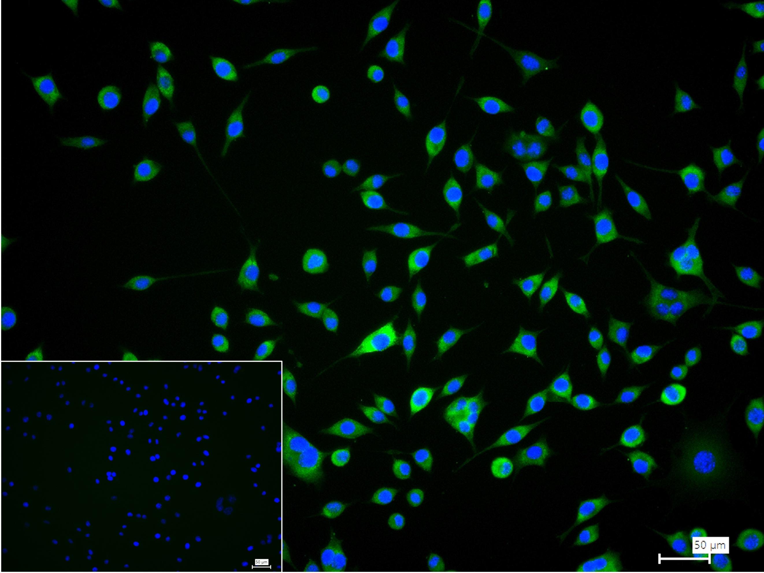 4% Paraformaldehyde-fixed SH-SY5Y (H) cell; Triton X-100 at r.t. for 20 min; Antibody incubation with (PKC epsilon) monoclonal Antibody, unconjugated (bsm-62955R) 1:100, 90 min at 37°C; followed by conjugated Goat Anti-Rabbit IgG antibody (green, bs-60295G-BF488) at 37°C for 90 min, DAPI (blue, C02-04002) was used to stain the cell nuclei. PBS instead of the primary antibody was used as the blank control.