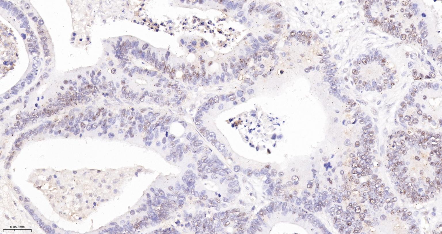 Paraformaldehyde-fixed, paraffin embedded Human Colon Cancer; Antigen retrieval by boiling in sodium citrate buffer (pH6.0) for 15 min; The section was incubated with PSMB10 Monoclonal Antibody, Unconjugated (bsm-62964R) at 1:200 overnight at 4°C, followed by conjugation to the bs-0295G-HRP and DAB (C-0010) staining.