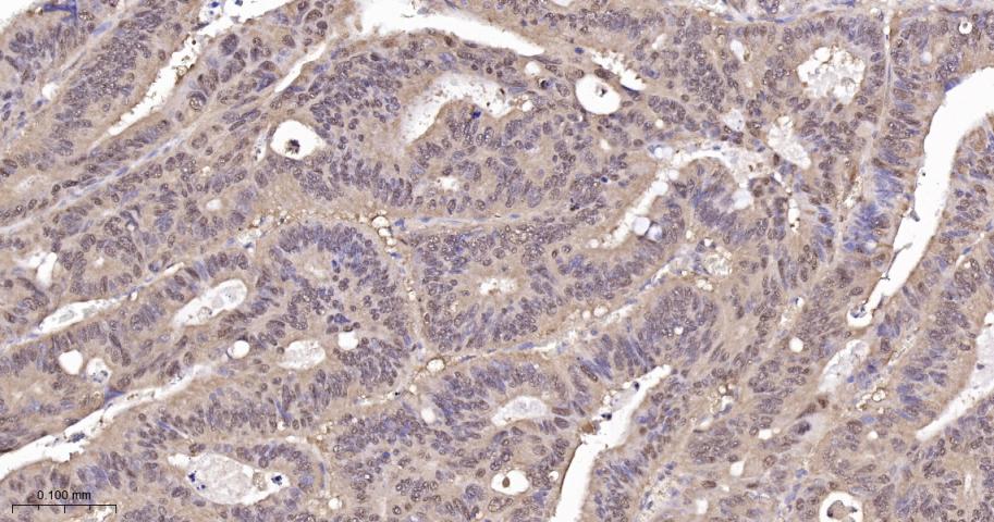 Paraformaldehyde-fixed, paraffin embedded Human Colon Cancer; Antigen retrieval by boiling in sodium citrate buffer (pH6.0) for 15 min; The section was incubated with RelB Monoclonal Antibody, Unconjugated (bsm-62968R) at 1:200 overnight at 4°C, followed by conjugation to the bs-0295G-HRP and DAB (C-0010) staining.
