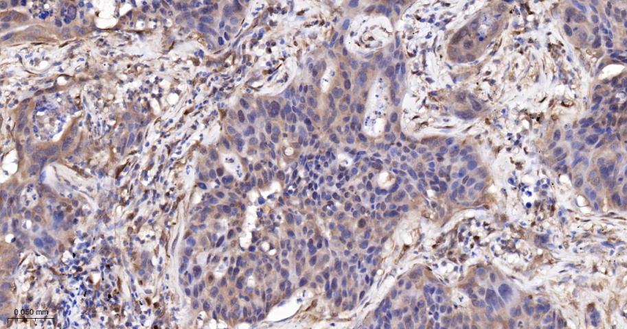 Paraformaldehyde-fixed, paraffin embedded Human Lung Cancer; Antigen retrieval by boiling in sodium citrate buffer (pH6.0) for 15 min; The section was incubated with RelB Monoclonal Antibody, Unconjugated (bsm-62968R) at 1:200 overnight at 4°C, followed by conjugation to the bs-0295G-HRP and DAB (C-0010) staining.