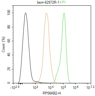 The MCF-7 (H) cells were fixed with 4% PFA (10 min at r.t.) and then permeabilized with 90% ice-cold methanol for 20 min at -20℃,the cells then were incubated in 5%BSA to block non-specific protein-protein interactions (30 min at r.t.), followed by secondary antibody incubation for 40 min at room temperature. Primary Antibody (green):Rabbit Anti-RPS6KB2 antibody (bsm-62972R,1:100); Isotype Control (orange): Rabbit IgG (bs-0295P). Blank control (black): PBS. Acquisition of 20,000 events was performed.