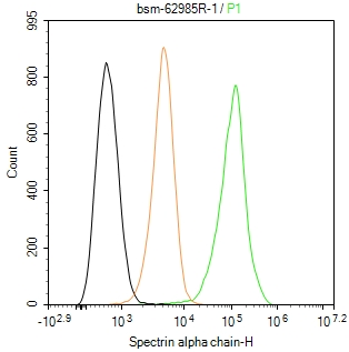 The K562 (H) cells were fixed with 4% PFA (10 min at r.t.) and then permeabilized with 90% ice-cold methanol for 20 min at -20℃,the cells then were incubated in 5%BSA to block non-specific protein-protein interactions (30 min at r.t.), followed by secondary antibody incubation for 40 min at room temperature. Primary Antibody (green):Rabbit Anti-Spectrin alpha chain antibody (bsm-62985R,1:100); Isotype Control (orange): Rabbit IgG (bs-0295P). Blank control (black): PBS. Acquisition of 20,000 events was performed.