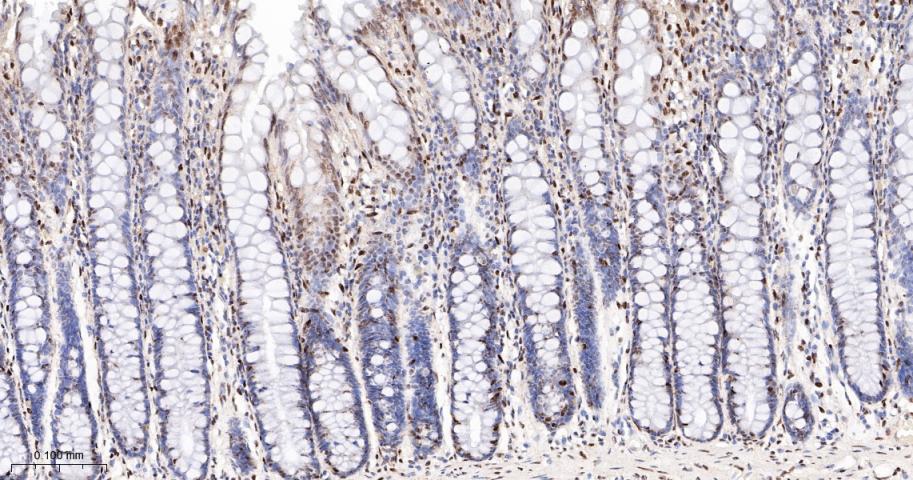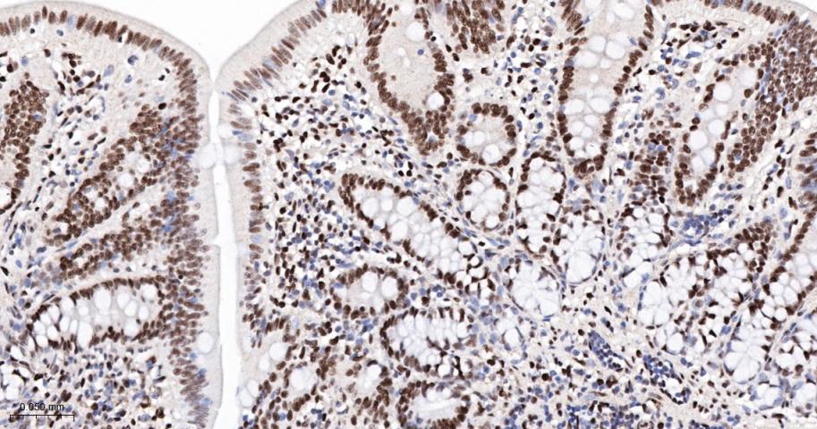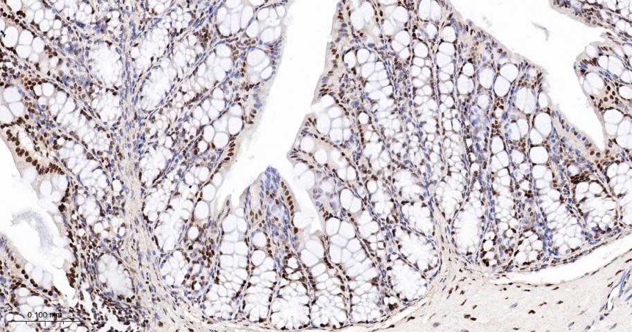 Paraformaldehyde-fixed, paraffin embedded Mouse Colon; Antigen retrieval by boiling in sodium citrate buffer (pH6.0) for 15 min; The section was incubated with TRIM28 Monoclonal Antibody, Unconjugated (bsm-63000R) at 1:200 overnight at 4°C, followed by conjugation to the bs-0295G-HRP and DAB (C-0010) staining.