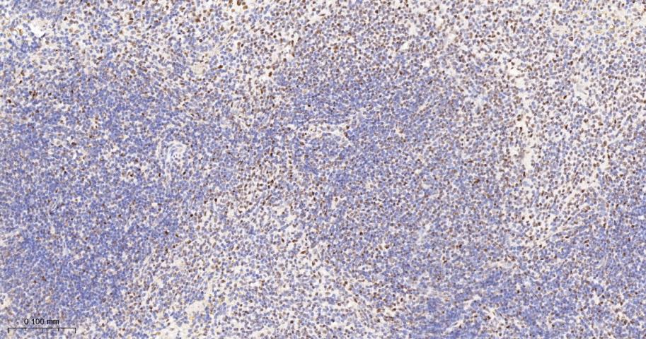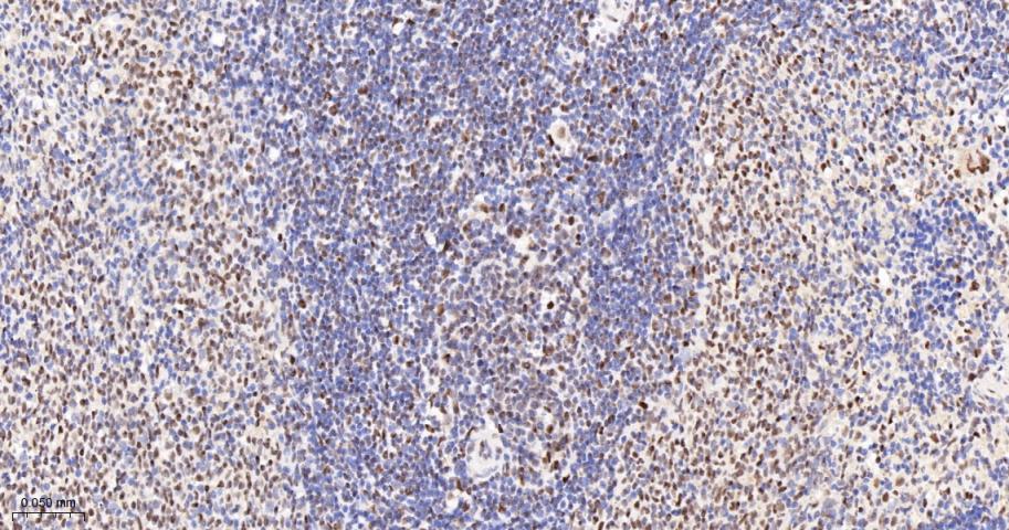 Paraformaldehyde-fixed, paraffin embedded Rat Spleen; Antigen retrieval by boiling in sodium citrate buffer (pH6.0) for 15 min; The section was incubated with TRIM28 Monoclonal Antibody, Unconjugated (bsm-63000R) at 1:200 overnight at 4°C, followed by conjugation to the bs-0295G-HRP and DAB (C-0010) staining.