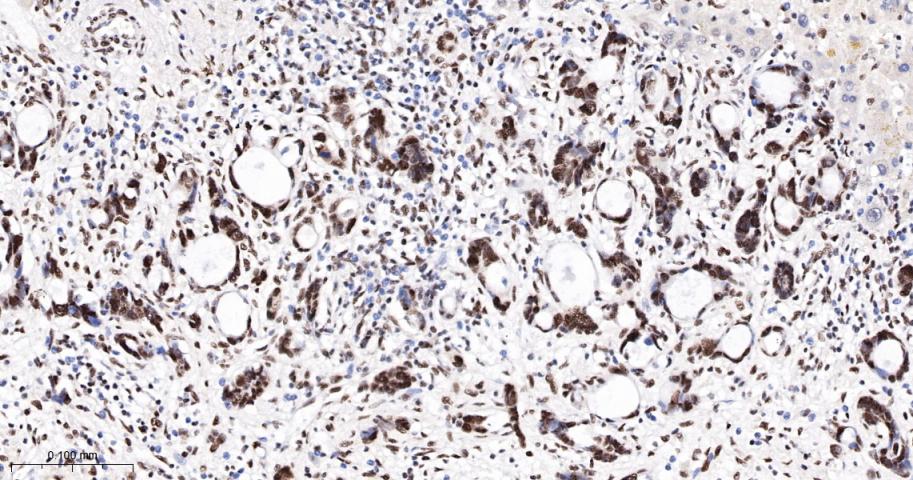 Paraformaldehyde-fixed, paraffin embedded Human Liver Cancer; Antigen retrieval by boiling in sodium citrate buffer (pH6.0) for 15 min; The section was incubated with TRIM28 Monoclonal Antibody, Unconjugated (bsm-63000R) at 1:200 overnight at 4°C, followed by conjugation to the bs-0295G-HRP and DAB (C-0010) staining.