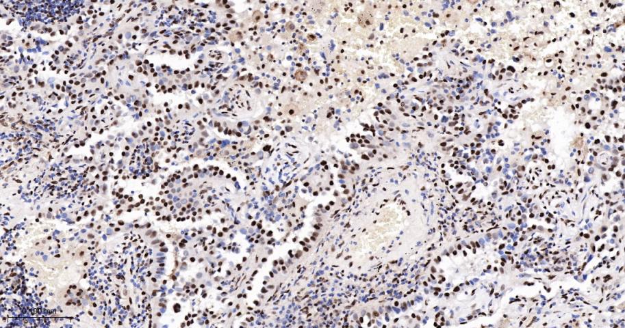 Paraformaldehyde-fixed, paraffin embedded Human Lung Cancer; Antigen retrieval by boiling in sodium citrate buffer (pH6.0) for 15 min; The section was incubated with TRIM28 Monoclonal Antibody, Unconjugated (bsm-63000R) at 1:200 overnight at 4°C, followed by conjugation to the bs-0295G-HRP and DAB (C-0010) staining.