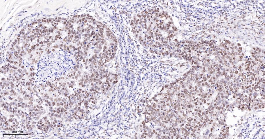 Paraformaldehyde-fixed, paraffin embedded Human Breast Cancer; Antigen retrieval by boiling in sodium citrate buffer (pH6.0) for 15 min; The section was incubated with TRIM28 Monoclonal Antibody, Unconjugated (bsm-63000R) at 1:200 overnight at 4°C, followed by conjugation to the bs-0295G-HRP and DAB (C-0010) staining.