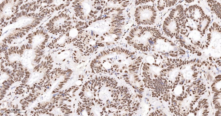 Paraformaldehyde-fixed, paraffin embedded Human Colon Cancer; Antigen retrieval by boiling in sodium citrate buffer (pH6.0) for 15 min; The section was incubated with TRIM28 Monoclonal Antibody, Unconjugated (bsm-63000R) at 1:200 overnight at 4°C, followed by conjugation to the bs-0295G-HRP and DAB (C-0010) staining.
