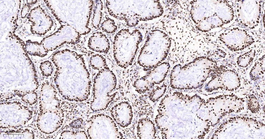 Paraformaldehyde-fixed, paraffin embedded Human Colon; Antigen retrieval by boiling in sodium citrate buffer (pH6.0) for 15 min; The section was incubated with TRIM28 Monoclonal Antibody, Unconjugated (bsm-63000R) at 1:200 overnight at 4°C, followed by conjugation to the bs-0295G-HRP and DAB (C-0010) staining.