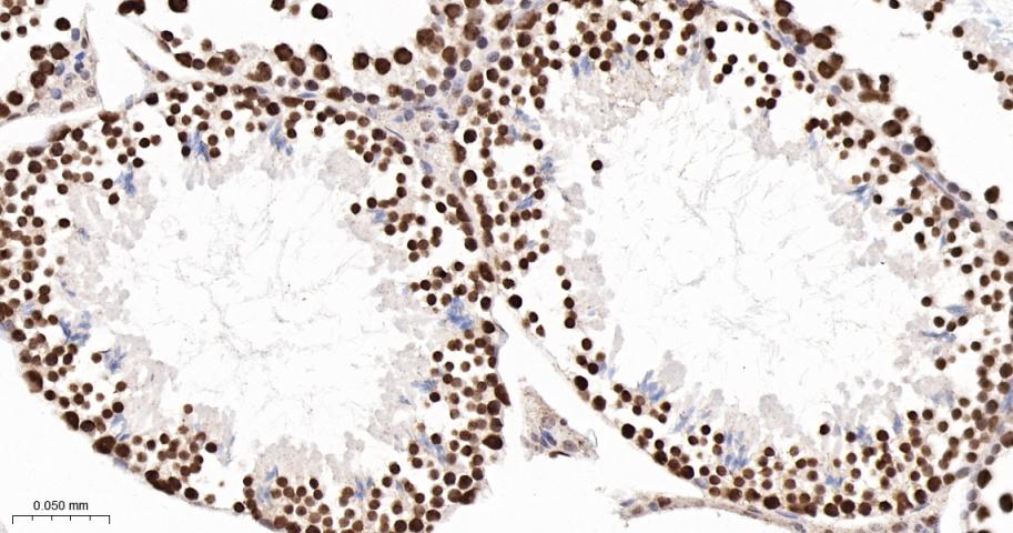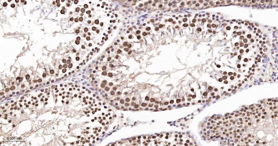 Paraformaldehyde-fixed, paraffin embedded Rat Testicles; Antigen retrieval by boiling in sodium citrate buffer (pH6.0) for 15 min; The section was incubated with TRIM28 Monoclonal Antibody, Unconjugated (bsm-63000R) at 1:200 overnight at 4°C, followed by conjugation to the bs-0295G-HRP and DAB (C-0010) staining.