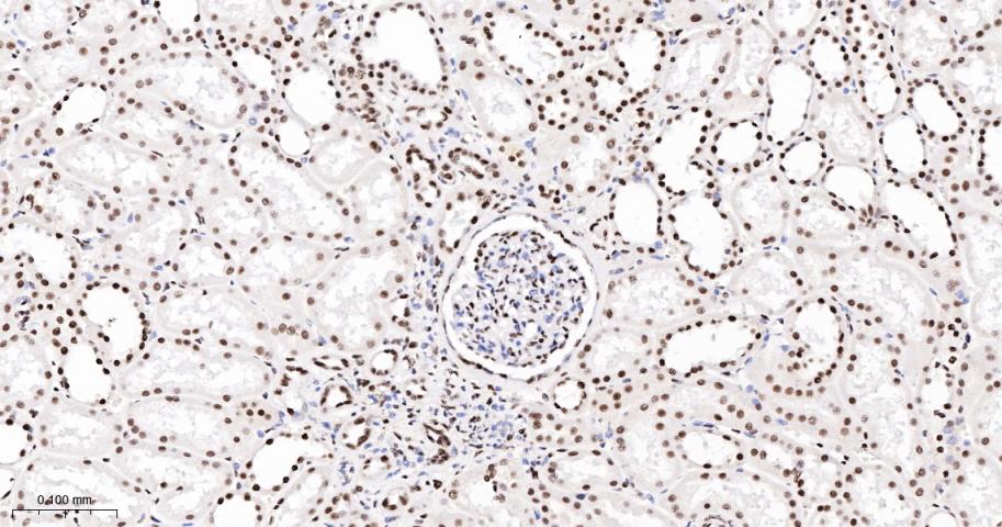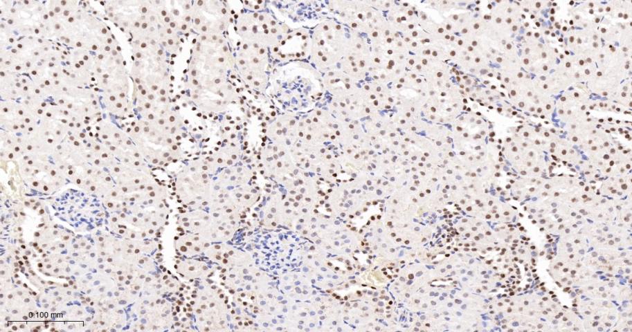 Paraformaldehyde-fixed, paraffin embedded Rat Kidney; Antigen retrieval by boiling in sodium citrate buffer (pH6.0) for 15 min; The section was incubated with TRIM28 Monoclonal Antibody, Unconjugated (bsm-63000R) at 1:200 overnight at 4°C, followed by conjugation to the bs-0295G-HRP and DAB (C-0010) staining.