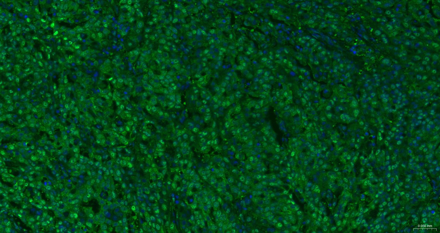 Paraformaldehyde-fixed, paraffin embedded Human Ovarian Cancer; Antigen retrieval by boiling in sodium citrate buffer (pH6.0) for 15 min; The section was incubated with UBA1 Monoclonal Antibody, Unconjugated (bsm-63004R) at 1:200 overnight at 4°C. Followed by conjugated Goat Anti-Rabbit IgG antibody (Green, bs-0295G-BF488), DAPI (blue, C02-04002) was used to stain the cell nuclei.