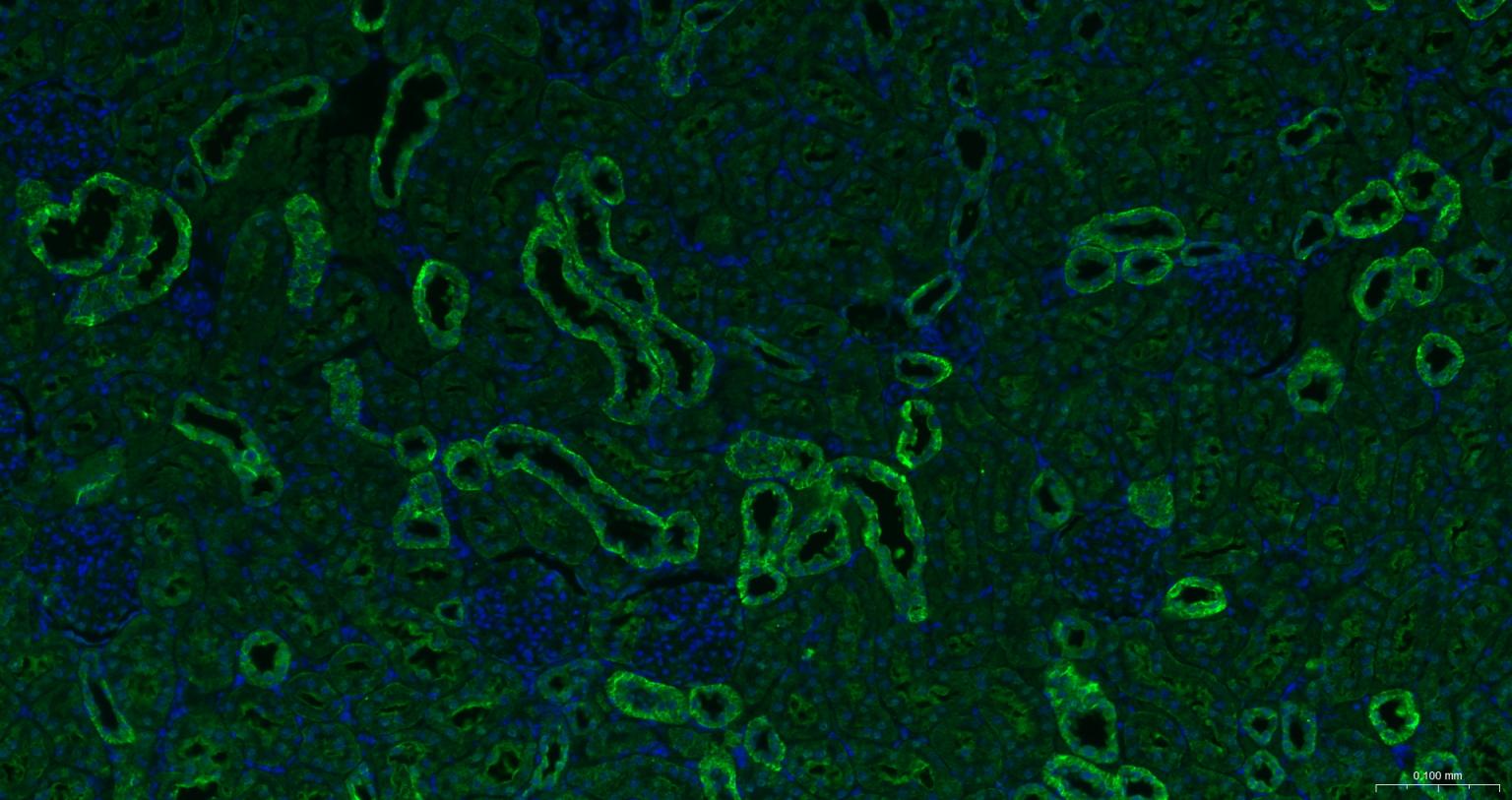 Paraformaldehyde-fixed, paraffin embedded Rat Kidney; Antigen retrieval by boiling in sodium citrate buffer (pH6.0) for 15 min; The section was incubated with UBA1 Monoclonal Antibody, Unconjugated (bsm-63004R) at 1:200 overnight at 4°C. Followed by conjugated Goat Anti-Rabbit IgG antibody (Green, bs-0295G-BF488), DAPI (blue, C02-04002) was used to stain the cell nuclei.