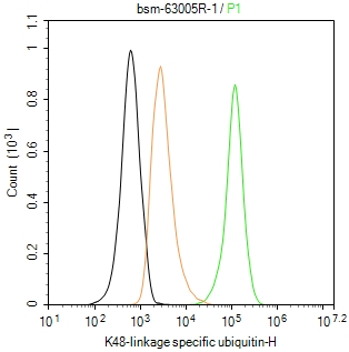 The HeLa ( treated with MG132 (50 µM, 90 minutes) ) (H) cells were fixed with 4% PFA (10 min at r.t.) and then permeabilized with 90% ice-cold methanol for 20 min at -20℃,the cells then were incubated in 5%BSA to block non-specific protein-protein interactions (30 min at r.t.), followed by secondary antibody incubation for 40 min at room temperature. Primary Antibody (green):Rabbit Anti-K48-linkage specific ubiquitin antibody (bsm-63005R,1:100); Isotype Control (orange): Rabbit IgG (bs-0295P). Blank control (black): PBS. Acquisition of 20,000 events was performed.