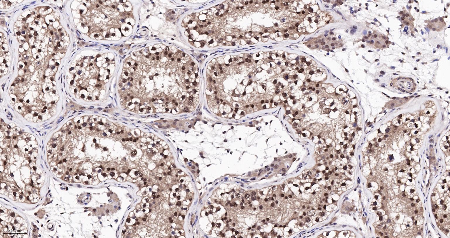 Paraformaldehyde-fixed, paraffin embedded Human Testicles; Antigen retrieval by boiling in sodium citrate buffer (pH6.0) for 15 min; Antibody incubation with K48-linkage specific ubiquitin Monoclonal Antibody, Unconjugated(bsm-63005R) at 1:200 overnight at 4°C, followed by conjugation to the bs-0295G-HRP and DAB (C-0010) staining and DAB (C-0010) staining.