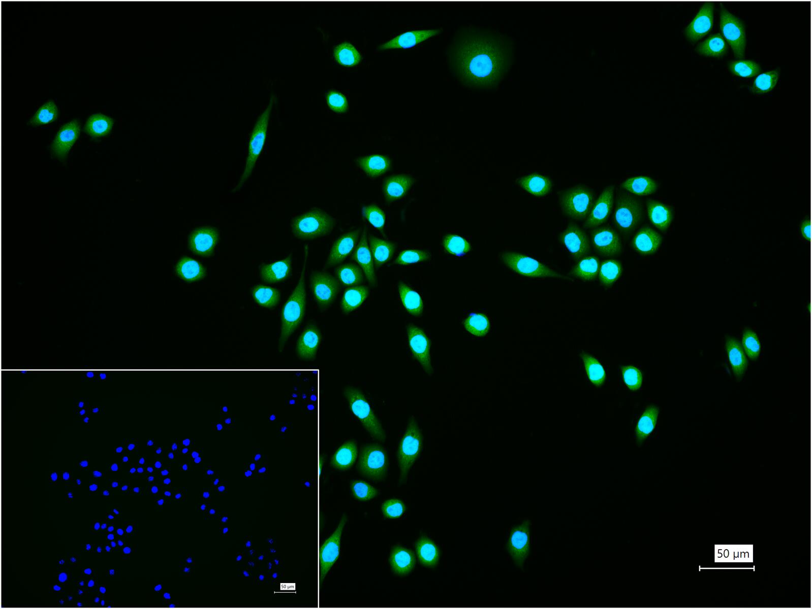 4% Paraformaldehyde-fixed HeLa (treated with 10uM MG-132 for 10 hours) (H) cell; Triton X-100 at r.t. for 20 min; Antibody incubation with (K27-linkage specific ubiquitin) monoclonal Antibody, unconjugated (bsm-63007R) 1:100, 90 min at 37°C; followed by BF488 conjugated Goat Anti-Rabbit IgG antibody (green, bs-60295G-BF488) at 37°C for 90 min, DAPI (blue, C02-04002) was used to stain the cell nuclei. PBS instead of the primary antibody was used as the blank control.