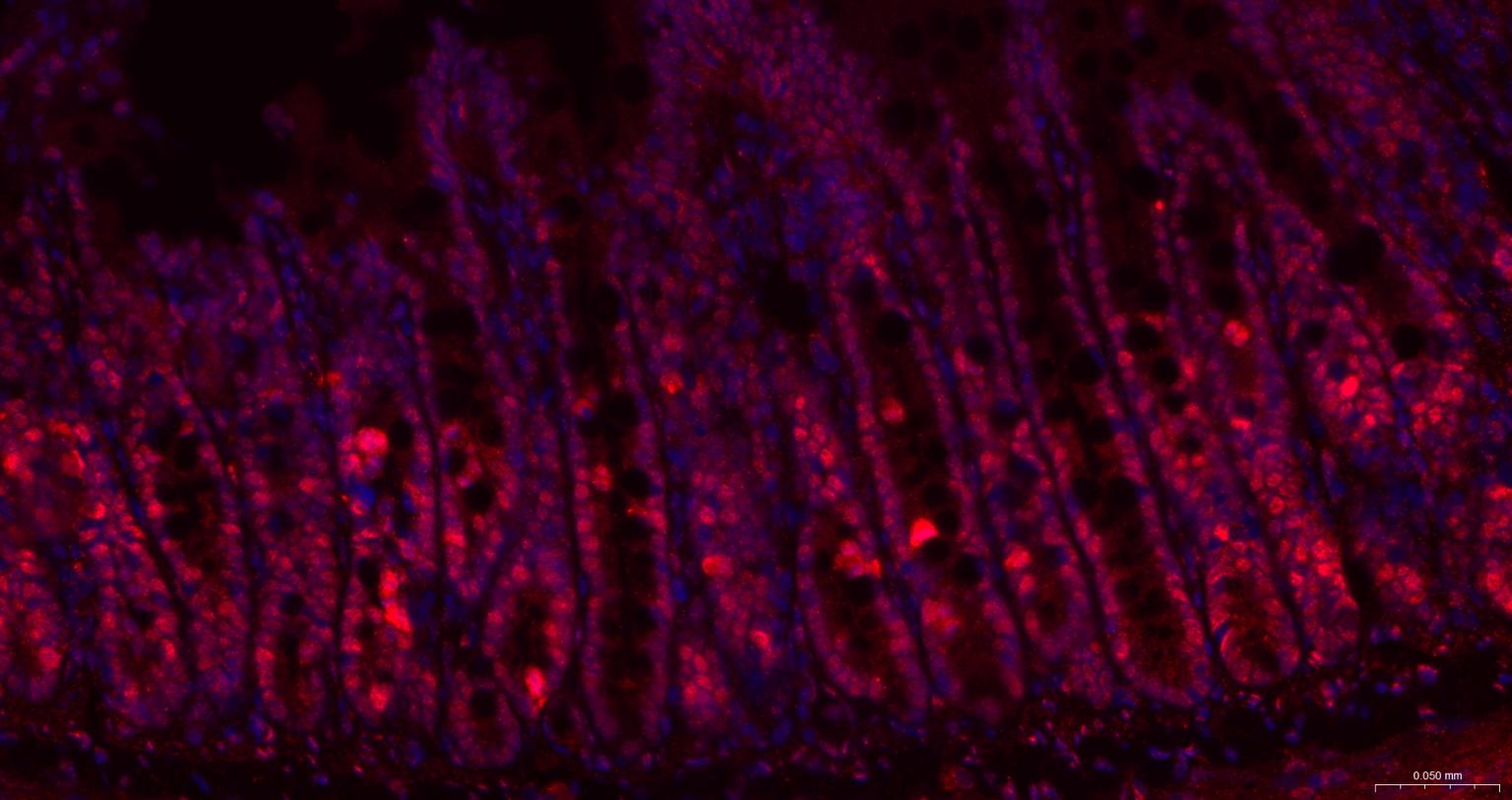 Paraformaldehyde-fixed, paraffin embedded Rat Small Intestine; Antigen retrieval by boiling in sodium citrate buffer (pH6.0) for 15 min; The section was incubated with phospho-UBF1(Ser484) Monoclonal Antibody, Unconjugated (bsm-63010R) at 1:200 overnight at 4°C. Followed by conjugated Goat Anti-Ratbbit IgG antibody (Red, bs-0295G-BF594), DAPI (blue, C02-04002) was used to stain the cell nuclei.