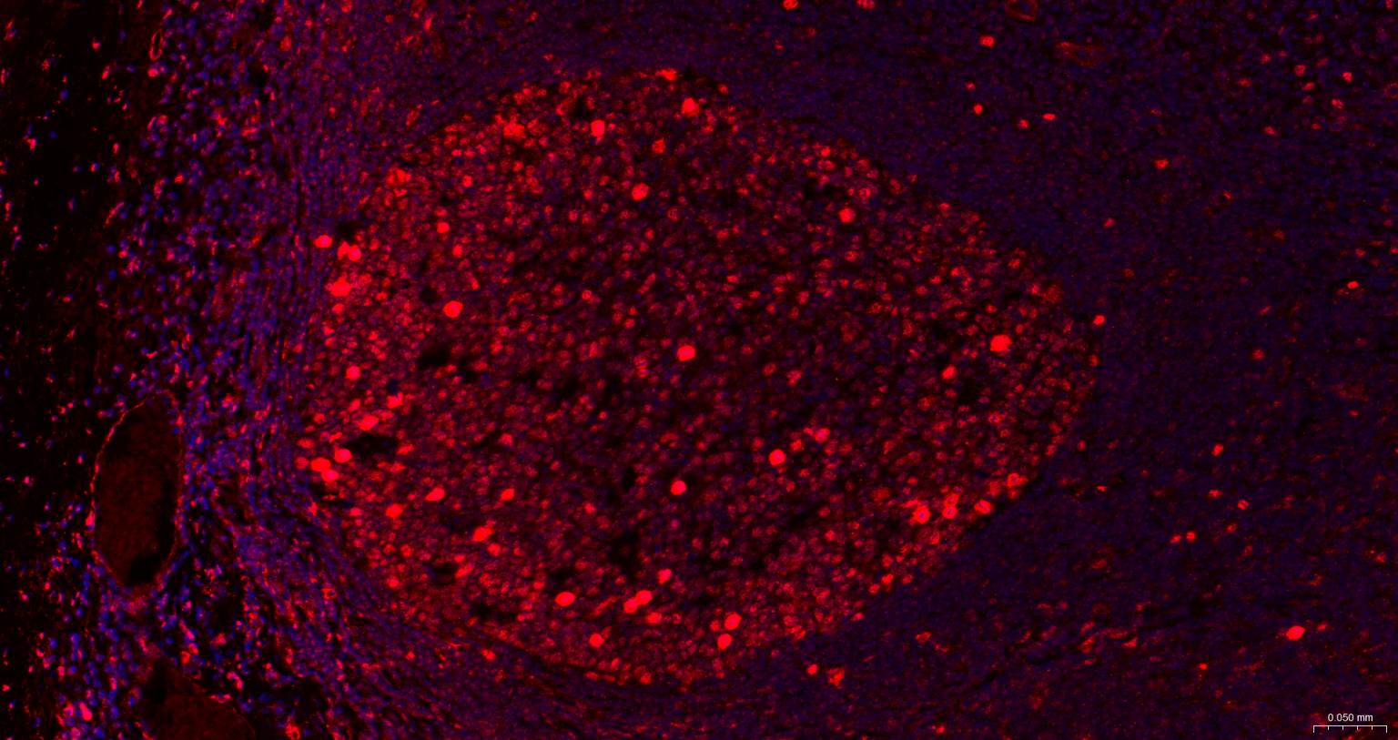 Paraformaldehyde-fixed, paraffin embedded Human Tonsil; Antigen retrieval by boiling in sodium citrate buffer (pH6.0) for 15 min; The section was incubated with phospho-UBF1(Ser484) Monoclonal Antibody, Unconjugated (bsm-63010R) at 1:200 overnight at 4°C. Followed by conjugated Goat Anti-Ratbbit IgG antibody (Red, bs-0295G-BF594), DAPI (blue, C02-04002) was used to stain the cell nuclei.