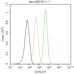 The U-87MG (H) cells were fixed with 4% PFA (10 min at r.t.) and then permeabilized with 90% ice-cold methanol for 20 min at -20℃,the cells then were incubated in 5%BSA to block non-specific protein-protein interactions (30 min at r.t.), followed by secondary antibody incubation for 40 min at room temperature. Primary Antibody (green):Rabbit Anti-UCHL3 antibody (bsm-63011R,1:100); Isotype Control (orange): Rabbit IgG (bs-0295P). Blank control (black): PBS. Acquisition of 20,000 events was performed.
