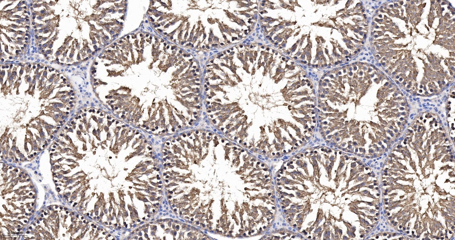Paraformaldehyde-fixed, paraffin embedded Rat Testicles; Antigen retrieval by boiling in sodium citrate buffer (pH6.0) for 15 min; The section was incubated with UCHL3 Monoclonal Antibody, Unconjugated (bsm-63011R) at 1:200 overnight at 4°C, followed by conjugation to the bs-0295G-HRP and DAB (C-0010) staining.