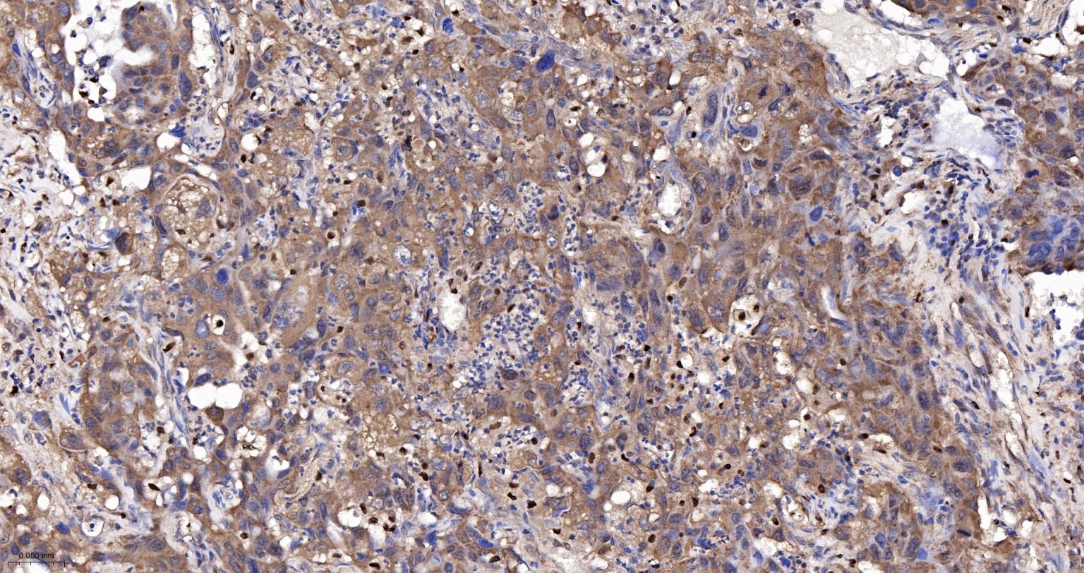 Paraformaldehyde-fixed, paraffin embedded Human Lung Cancer; Antigen retrieval by boiling in sodium citrate buffer (pH6.0) for 15 min; The section was incubated with UCHL3 Monoclonal Antibody, Unconjugated (bsm-63011R) at 1:200 overnight at 4°C, followed by conjugation to the bs-0295G-HRP and DAB (C-0010) staining.